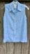 Collared, button up sporty sleeveless linen top in white and turquoise blue check. Has side vents to wear untucked if desired. Light and breathable.