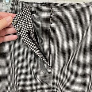 Black and white checkered flat-front, high-rise, wide-leg dress pant. Fully lined, with a front zipper fly and double hook & eye closure with additional hidden button. Side slit pockets and back welt pockets with button closure on each. Self waist with minimal belt loops.
