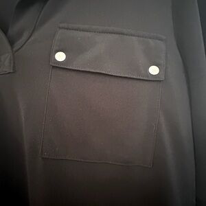 Chic and versatile, this black V-neck shirt from Jones New York is the perfect addition to your wardrobe! In size Small, this top features long sleeves with stylish 3/4 sleeve button detail, adding a modern touch. Made from a comfortable blend of 95% polyester and 5% spandex, it offers just the right amount of stretch for a flattering fit. Two front breast pockets complete the look, making it both functional and fashionable.