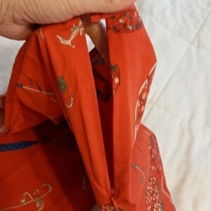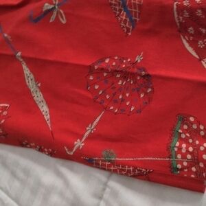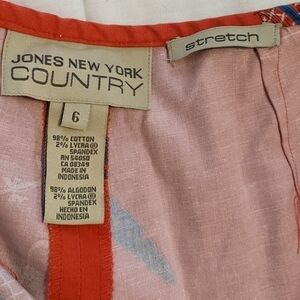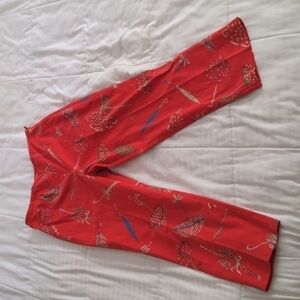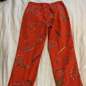 Jones New York country cropped umbrella pants size 6. Such a fun whimsical pair of pants. the main color is and orangey red with bright blue and green umbrellas. athlete are no pockets but there is a zipper on the side. Flat front. Waist measurement is 14 inches, the rise measures 11 in and the inseam is 25 inches. super cute!!