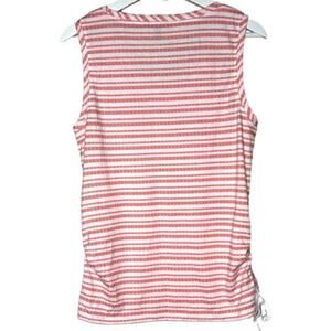 JONES New York Striped Cardigan and Top Two Piece Set. The colors are White and Peach. The top has ties on the side that can be adjusted to create rouching. The cardigan is an open cardigan with pockets that have two gold non functioning buttons on each upper corner for an accent. The sleeves have ties that can be adjusted.