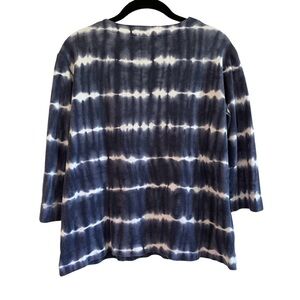 JONES OF NEW YORK, WOMENS, BLUE & WHITE TIE DYED, 3/4 SLEEVE, CROP TOP. PLACKET V-NECK. IN 100% COTTON FABRIC. SIZE L