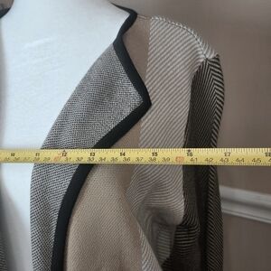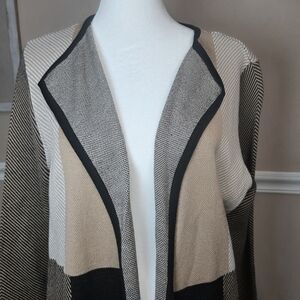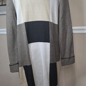 Chic long cardigan with a colorblock design. Features black, cream, and gray tones. Perfect for layering.