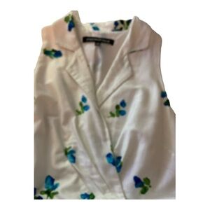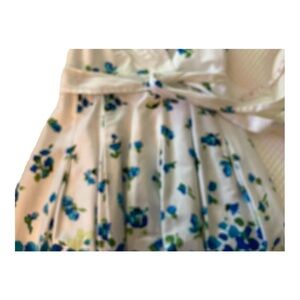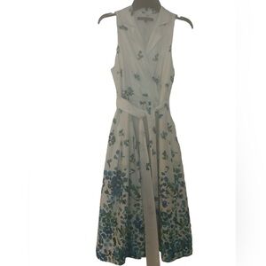 JONES WEAR DRESS, white with blue floral. Faux wrap top, belted, fit & flare.