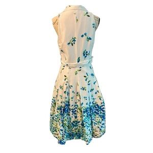 Fresh as Spring, this dress is perfect. It is sleeveless with a faux wrap top and a belted waist. Fit and flare style, knee length. The colors of blue and green are vibrant on the white background.