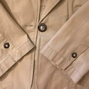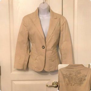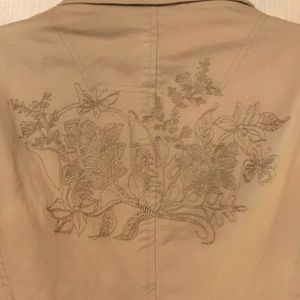 New without Tags | Misses Size 10 | Short Jean Jacket in Beige with Tonal Embroidery in Back (Butterflies and Flowers) | Three Pockets, One Button Closure, Button on Cuff, Two Back Vents | 98% Cotton, 2% Spandex | Measurements: 21-1/2" Shoulder to Bottom, 19-1/4" Sleeves, 16-1/2" Shoulder to Shoulder