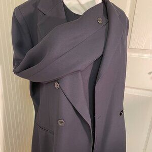 Jones Wear navy two piece suit with sheath dress and double breasted jacket, size 12. Both dress and jacket are a polyester blend of 58% polyester and 42% acetate and are fully lined in a navy lining of 100% acetate. Jacket has two rows of buttons, button on each sleeve, slash pockets on the side of each front that have never been opened.