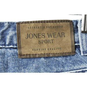 Trendy vintage 90s deadstock Jones Wear Sport from Jones Apparel Group (Jones New York) medium acid wash high waisted tapered mom jeans. Classic fit. 5 pockets, zip fly with button closure. Back suede embossed patch. New without tags (NWOT), has original size sticker.
