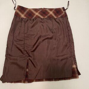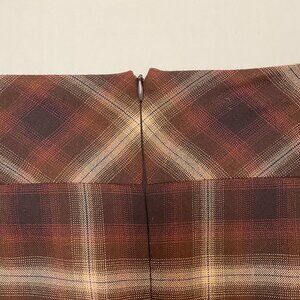 Jones Wear Skirt Size 10. Knee length brown plaid that is fully lined. Hidden zipper on back. Skirt is a polyester blend of polyester, rayon and spandex for stretch. Please along bottom of front with a kick pleat within the pleats. Decorative leather buckle.