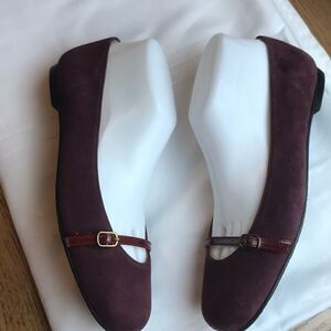 Jon Joseph wine colored flats with pretty strap and buckle embellishment across toe area. Suede. Shoes are nicely padded for comfort. Made in Spain. Original price $195. New in box. High end, gorgeous