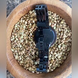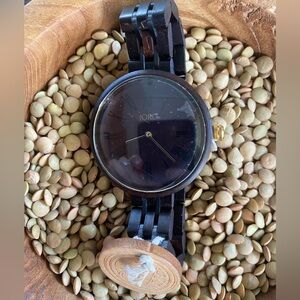 Elegant dark brown wooden watch by JORD. Features a sleek design with a unique wooden band. Double expand closure. Like New condition, plastic still on the “screen”