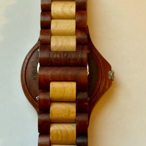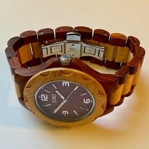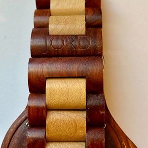 Unique wood watch by sustainable brand JORD. Cherry and maple woods. Band length 8.5 inches, deployment buckle w/ push button, quartz movement.