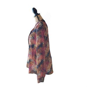 The over blouse is semi-sheer black with multi-color red rust and cream palm print.