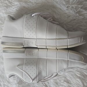 These white sneakers feature a sleek, modern design with a smooth synthetic upper and a traditional lacing system. The rounded toe box and flat profile offer both style and comfort, making them perfect for everyday wear.
