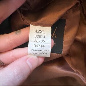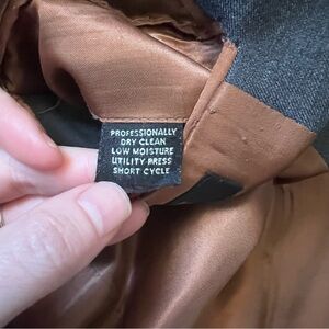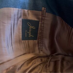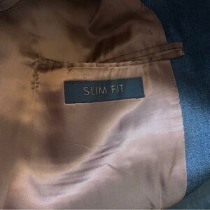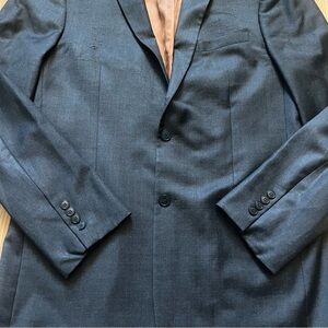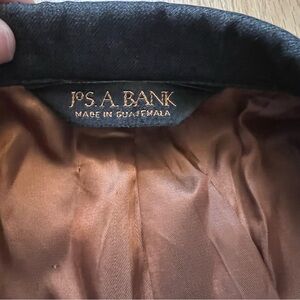 100% Wool Jos A Bank dark gray Sports Coat Blazer with satin feel interior. Slim Fit. 2 button closure. Great preowned condition, only flaw is on the button sleeve cuff-pictured. Button is broken. Internal and external pockets.
