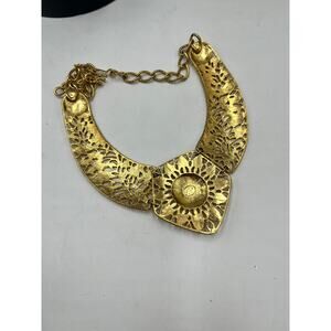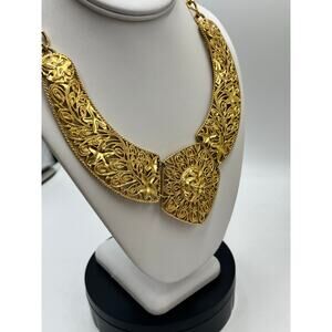 This ornate, gold tone vintage necklace is a Barrera for Avon statement piece called 'Falling Leaves. The design features open scrollwork with solid "falling leaves" interspersed. The three rigid pieces are a choker around your neck - making quite a dramatic impact. It has an Egyptian jewelry vibe that makes it a particularly fun piece to wear.