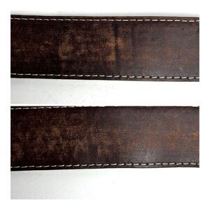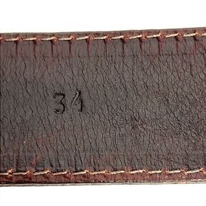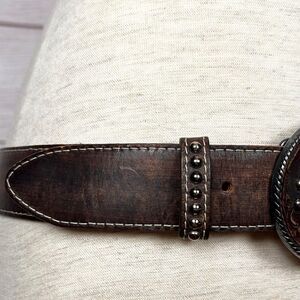 AMAXING Jose Luis Belt with studded metal and etched leather buckle. Brown distressed leather. Size 34 will fit from 33.5" to 37.5". Unisex belt is 1.5" thick. Made in Spain. Excellent condition