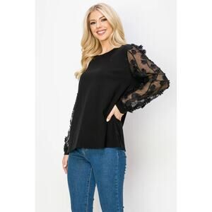 Our Rainah top made with high quality pointe knit and sheer flower lace sleeves. Round neck and long sleeves. Stylish and comfy. Timeless, stylish and chic.