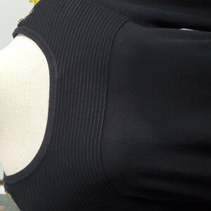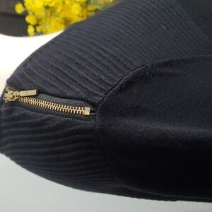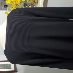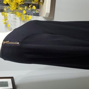 This black knit dress has long sleeves. minamalist Y2K. Exposed zippers at the shoulders. slits on both sides. There is no size tag, but I'm guessing large or maybe even extra large. pit to pit flat measurement is 22". sleeves are 21". top to bottom length is 35".