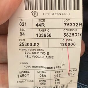 Size 44R. Joseph Abboud Collection for Nordstrom. Great condition - one small thread pull on sleeve - see last 2 photos. 52% Silk, 48% Wool. Textured grey/tan pattern. 2 button front. 4 buttons on sleeves. 2 front pockets, 1 breast pocket, 3 inside pockets. Double vent on back. Model in photo is 5’11”, wears 42R, waist 34. So fit may differ. Approximate measurements (taken when laying flat- cannot guarantee fit):