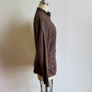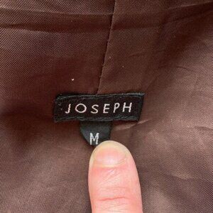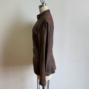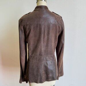 Details: JOSEPH soft brown sueded leather jacket with belted waist w/ snap closure, two patch pockets, mandarin collar, and epaulettes. Fully lined with front zipper and snap closure. Relaxed leather with a distressed look. Light weight. Made in Italy.