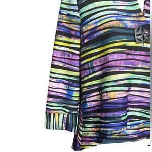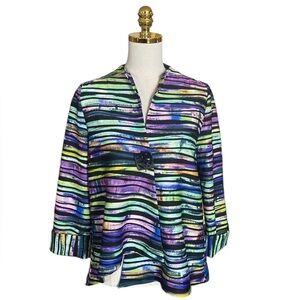 Elevate your style with this vibrant multicolor striped blazer. Dress up in style with this Joseph Ribkoff blazer. The multicolored striped pattern and textured design make it a unique addition to your wardrobe. Perfect for any occasion, whether it's for a party, cocktail event, or even for business, this blazer is a versatile piece that will keep you looking classy and timeless all year round.