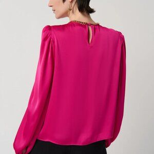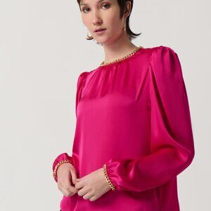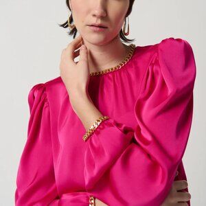 JOSEPH RIBKOFF satin puff sleeve top with gold chain in shocking pink