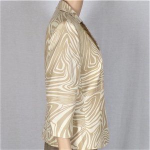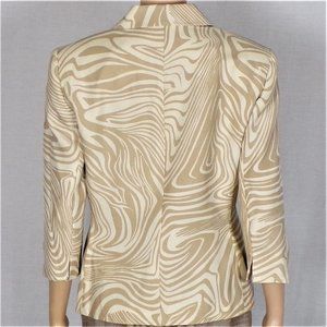 100% SILK (POLYESTER LINING) BEIGE & CREAM BLAZER BY JOSEPHINE CHAUS, SIZE 6. Pre-owned, exc. cond., pin hole in left sleeve (picture #5), otherwise no defects or damage, little sign of wear. 3/4 sleeves with slit ends, padded shoulders, collar & lapels, 3-button closure in front, fully lined in beige polyester (picture #6). Measurements: chest, pit to pit 19.5"; waist (between 2 lower buttons) 17.25"; flare (hemline) 18.75"; shoulder 16.5"; sleeve 18"; length in back collar seam to hem 22.5".