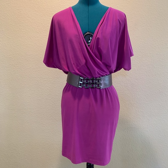 Magenta knit dress with drapey cross front upper body but bodycon from the waist down
