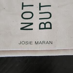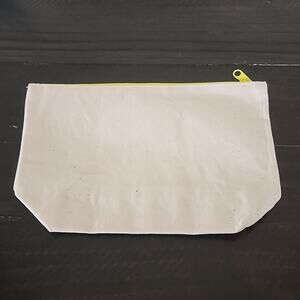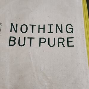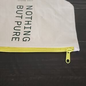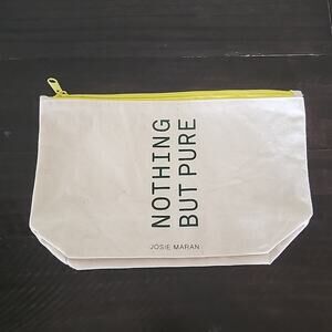 JOSIE MARAN makeup travel canvas bag. Use for travel, makeup, cosmetics, toiletries, skincare and more. Bag zips up and the zipper section is yellow. Natural canvas material. "Nothing but Pure" printed on bag.
