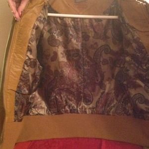 Brand new never used, Faux leather jacket. Tan on the outside and beautiful parsley pattern on the inside. Multiple pockets easily accessible. Perfect for fall type weather. Says size large but wouldn't actually fit someone who is a size large which is very weird. Fits me and I wear a size small/ medium.