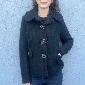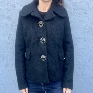 Jou Jou black wool coat. Has a faux curly lambswool texture. Nice large flower statement buttons. Pockets. Purple lining. Womens medium