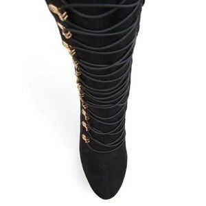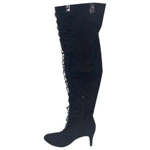 Make a bold statement in these vintage-inspired over-the-knee boots featuring soft vegan suede and a wide calf detailed with an inside zipper and a lace-an-loop accent at the vamp. Brand new in box, never worn, brand new-like condition.