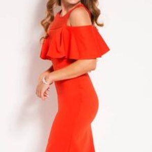 Radiate a youthful and sophisticated glow that could charm everyone in this exquisite Jovani 51308 creation. Tracing with savvy lines sculpting the silhouette on a vibrant neoprene fabric, this gorgeous piece shows a jewel neckline with an underscoring ruffled panel. Trimmed with cold-shoulders and fluttering short sleeves, the sheath skirt defines the female form from the hips to its knee length hemline. Make the most of your magnetic flair in this darling formal Jovani masterpiece.