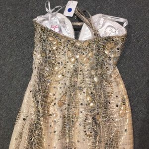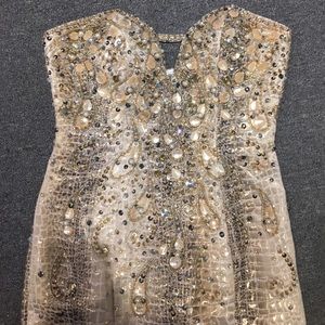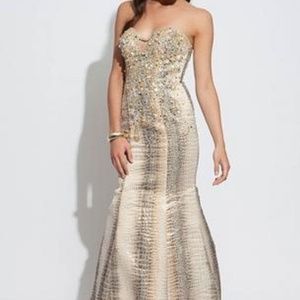 NWT - gold snakeskin size 0 strapless long mermaid dress features a sweetheart neckline and crystal embellishment -Note this is from a closed bridal boutique in good condition and being sold as is at a reduced price . (Bin C5999)