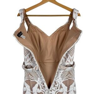 DETAIL: SWEETHEART NECK. OFF THE SHOULDER. FITTED. FLORAL EMBELLISHED MESH. SLIM WAISTBAND. STRUCTURED "HORSEHAIR" HEM.