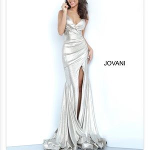 Metallic fabric, form fitting silhouette, floor length, sweeping train, high slit, pleated sleeveless bodice, V Neck, spaghetti straps over shoulders, low back with ruching.