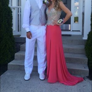 Reposting on this app after a sale fell through. I wore this dress to my senior prom and it is stunning! Pictures do not do it justice. This is a real Jovani coral colored dress size 2. I paid 500$ plus alterations so please keep that in mind when concerning the price. I am 5'4 and wore 2 inch heels with a train on the back of the dress professionally altered. I did NOT get it taken in anywhere besides the bottom of the dress. Please let me know if you have any questions or need more photos!