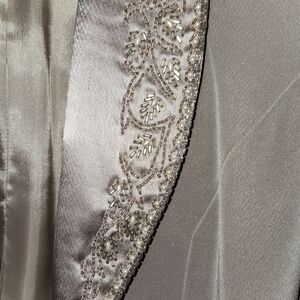 Stunning taupe gown paired with a matching beaded jacket. Perfect for formal occasions. Elegant and sophisticated design. Gown was altered to size 10. mint preowned condition.