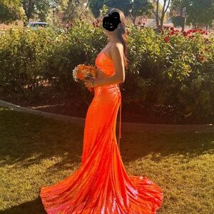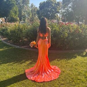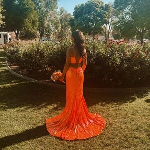 Jovani bright orange sequin open back dress size 0 in great condition only worn once, (a few marks on the inside bottom of the dress from the ground but not visible on the outside of the dress at all).