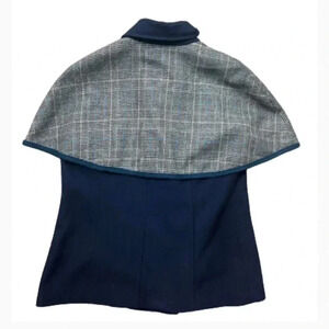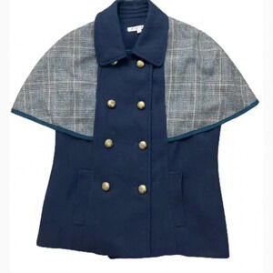 JOY JOY CAPE DARK BLUE PLAID WOOL DOUBLE BREASTED GOLD BUTTON SIZE SMALL