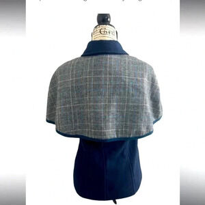 Joy Joy Vest Cape dark blue plaid print button front flat front pockets. Lined. Great with turtleneck skirt or jeans