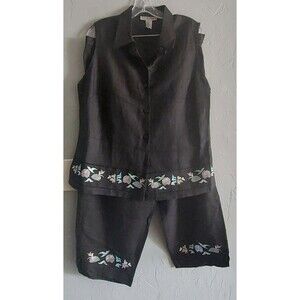 Vintage Joy & Peace two-piece set made of a linen and rayon blend, soft and lightweight. Includes a sleeveless button-down top and matching pants. Both pieces feature delicate floral embroidery in pastel tones, adding a unique and elegant touch.