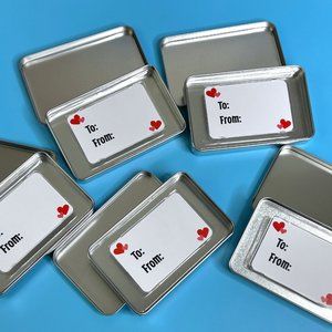 Tin boxes measure 5 x 3.25 x 0.75 inches