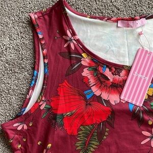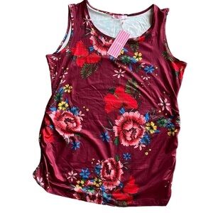 Joymom sleeveless maternity tank top. Polyester and spandex. New with tags. Burgundy with bright flowers of red,pink, blue and yellow. Cinching on the sides with elastic. Size XL, P2P 21”,length aprox 31”