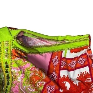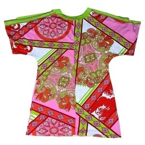 Joyous & Free pullover mini-dress in orange, lime green and pink. Deep V neckline and dolman cold shoulder sleeves accented with beads and studs. Stretchy. 60's vibe. Very slight snagging on the back of the green neckline. Please see photos prior to purchase. Super cute dress! Pit to pit 19". 30".