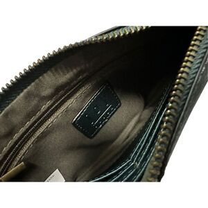 Features deep teal metallic vegan leather, 2 Straps included for versatility as clutch or over the shoulder, 6 credit card slots, printed lining, interior zipper pocket and brass plated hardware.