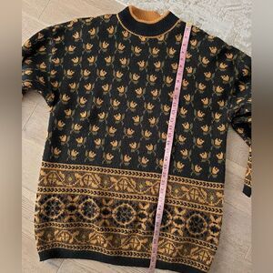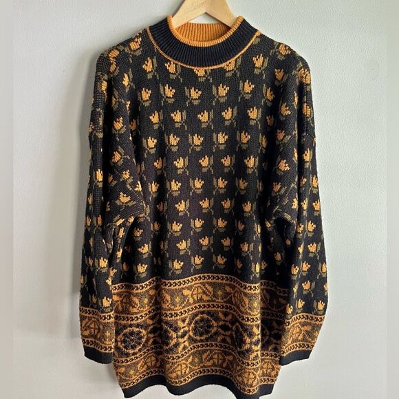vintage floral sweater, tulip print knit, retro fall sweater, 90s aesthetic pullover, cozy grandmacore, soft knitwear, oversized sweater, mustard and black, JP Collections vintage, bold knit top, Fair isle-style hem, floral tulip motif throughout, ribbed collar and cuffs