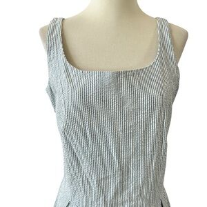 Womens size Medium, 100% cotton, bringing back the 50’s era, seersucker, stripes, sleeveless, back zipper, knee length. NOTE belt loops but no belt included.