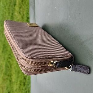 JPK Paris 75 nylon wallet. Color Tan with gold hardware. 10 spaces for cards, plus window space for ID, along with 2 zipper compartments each with full length storage. Measurements approximately 8x4x1.5. In excellent condition